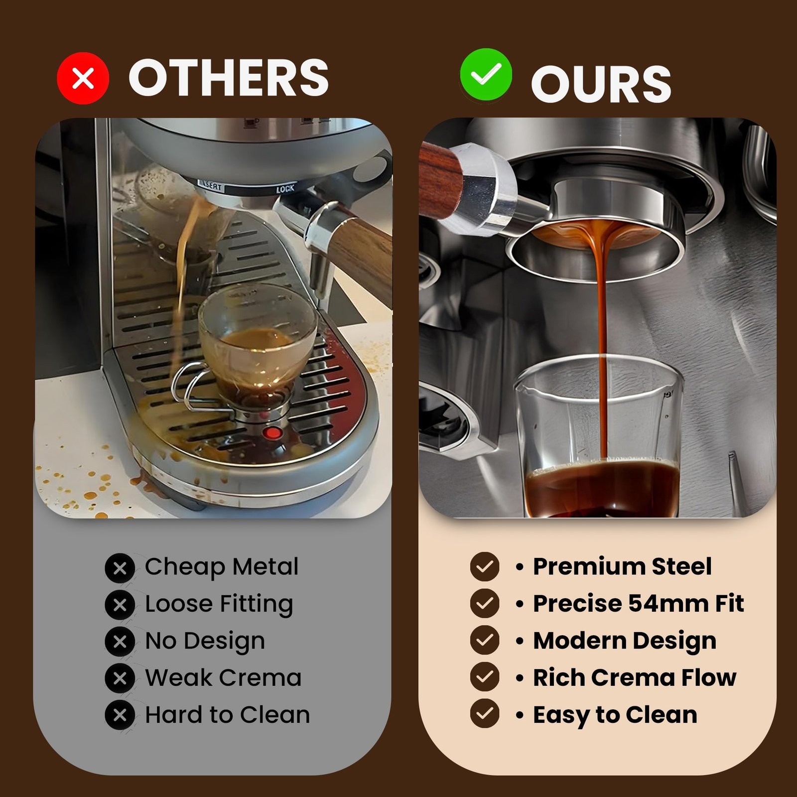 Crafted for durability, the portafilter 54mm features a premium stainless-steel head and a stylish rosewood handle, combining elegance with a secure grip. The ergonomic wooden handle minimizes hand fatigue, making this bottomless portafilter compatible design ideal for both home baristas and professionals.